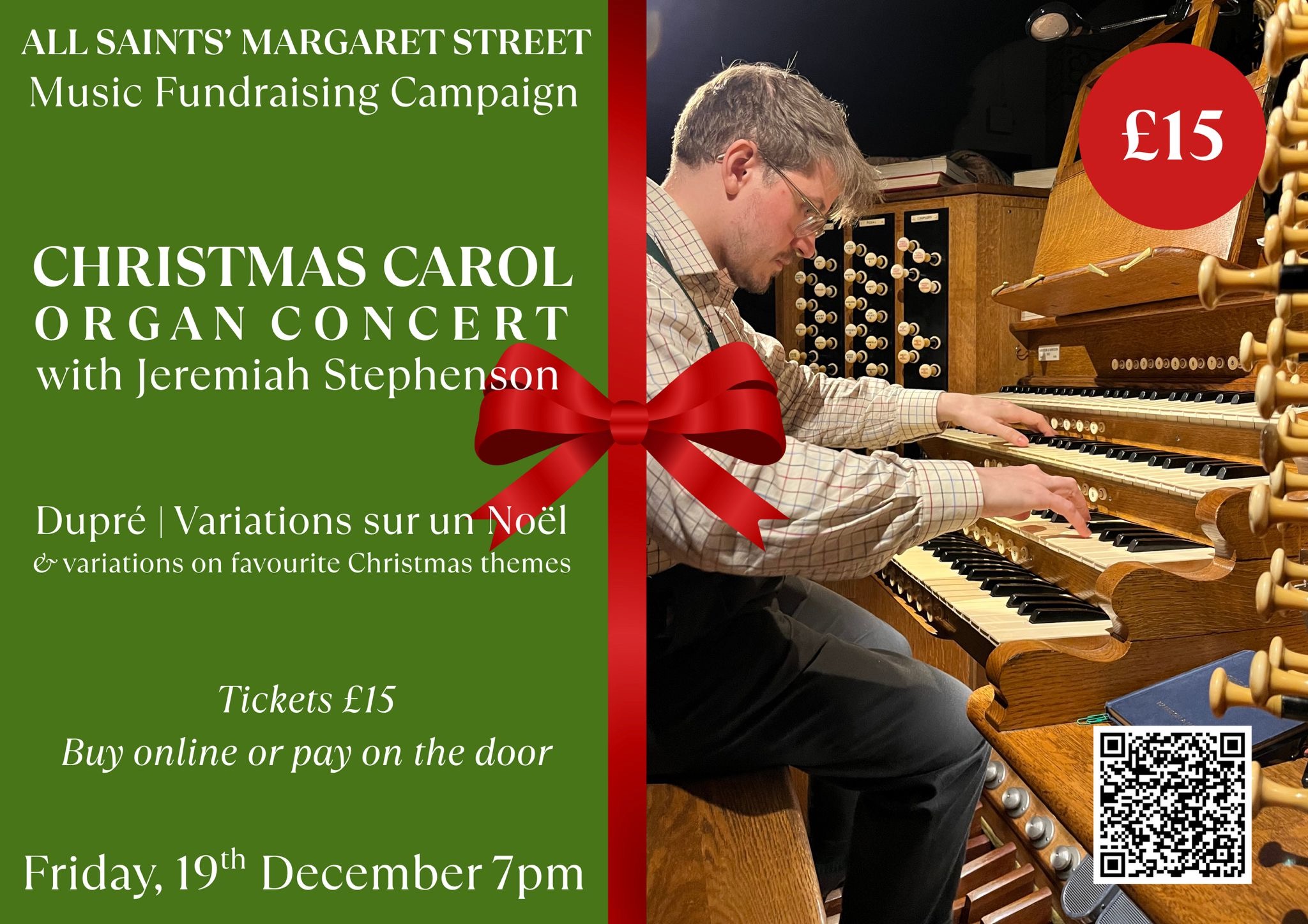 The programme includes: Dupré’s Variations sur un vieux Noël; plus improvisation on a series of well known and loved Christmas carols. Tickets are £15 each and you can book here.
