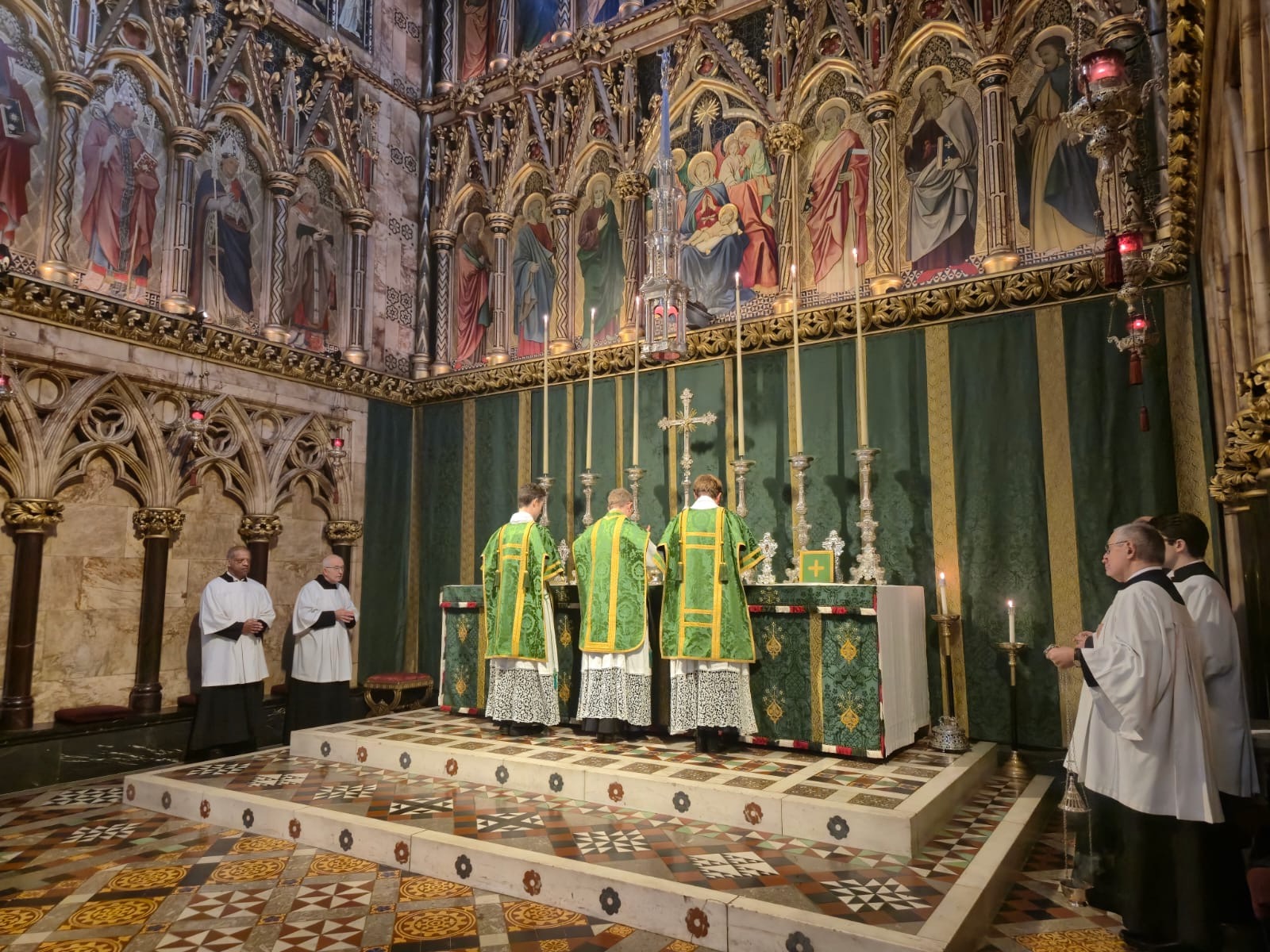 Solemn Evensong and Benediction in the evening will include our customary Te Deum sung in the presence of the Blessed Sacrament. The Music will include: Howells, Gloucester Service; Bullock, Give us the wings of faith; Stanford, Te Deum in B♭; Bortniansky, arr Caplin, O Salutaris; and Harwood, arr Caplin, Tantum Ergo.